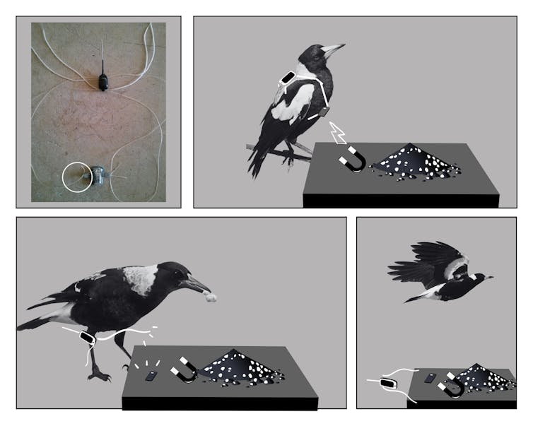We trained a group of local magpies to come to an outdoor, ground feeding “station” that could either wirelessly charge the battery of the tracker, download data, or release the tracker and harness by using a magnet.